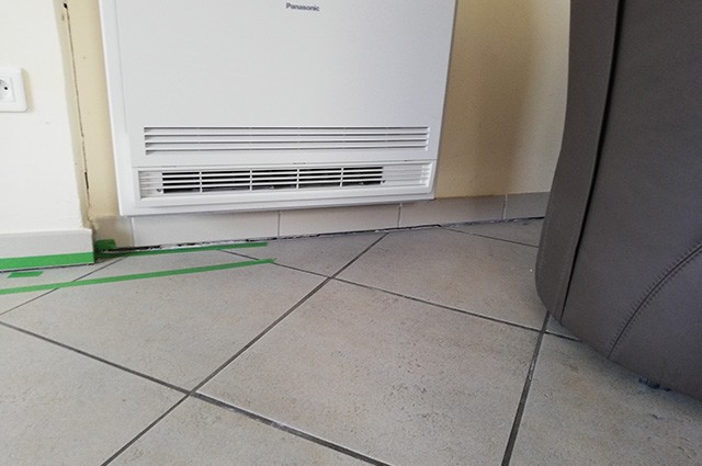 Ensuite, l'équipe d'intervention a injecté la résine expansive exclusive sous le dallage affaissé de l'extension concernée. Cette opération réalisée sur 4 m2 jusqu'à une profondeur de 0,5 m, a permis de remettre le dallage dans sa position initiale et combler ainsi les vides sous plinthes.