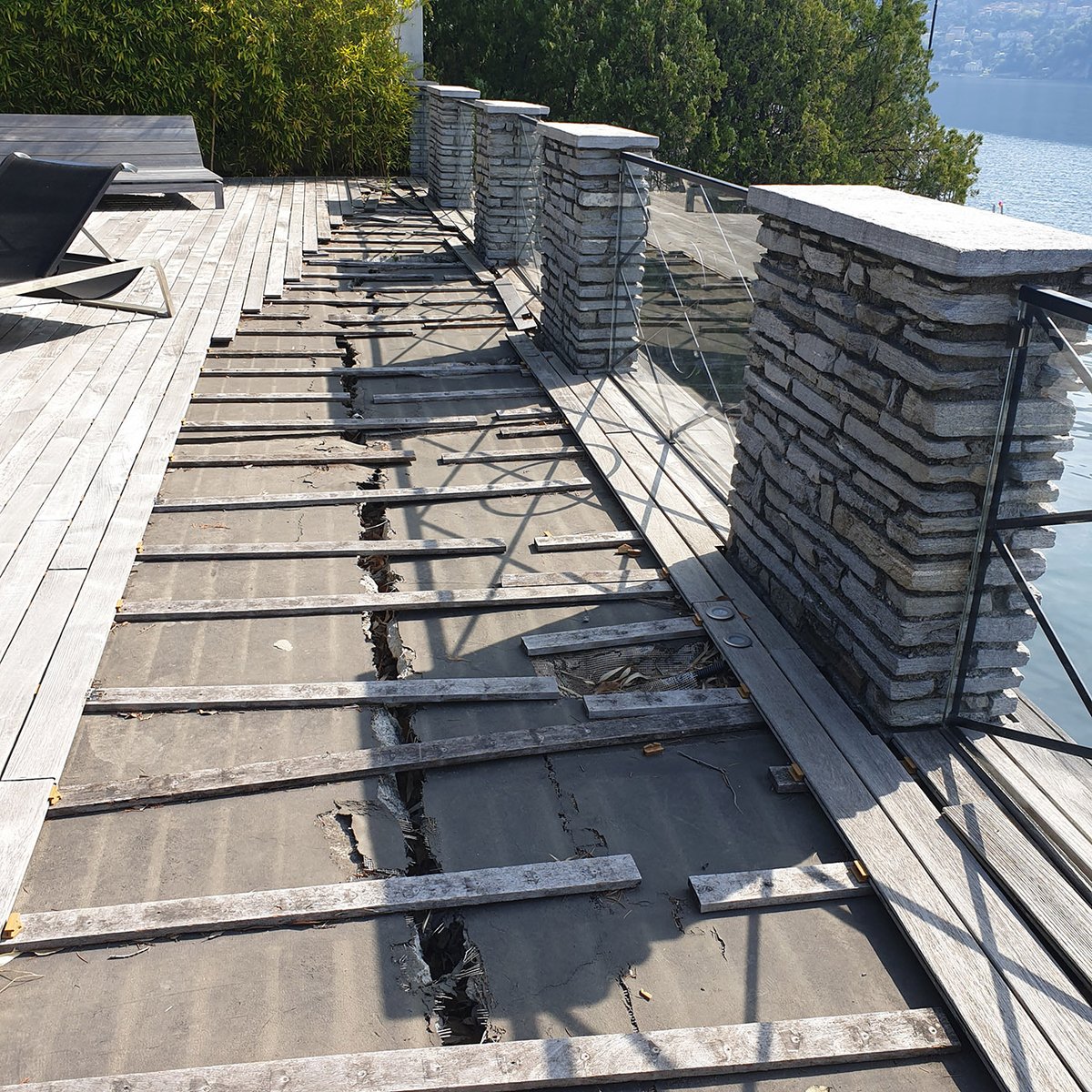 Consolidation rapide d'un mur de soutènement sur le lac de Côme à Cernobbio, Italie, confronté à des affaissements et des lésions, en utilisant les technologies URETEK Deep Injections®, URETEK Walls Restoring® et URETEK Microanchors®.